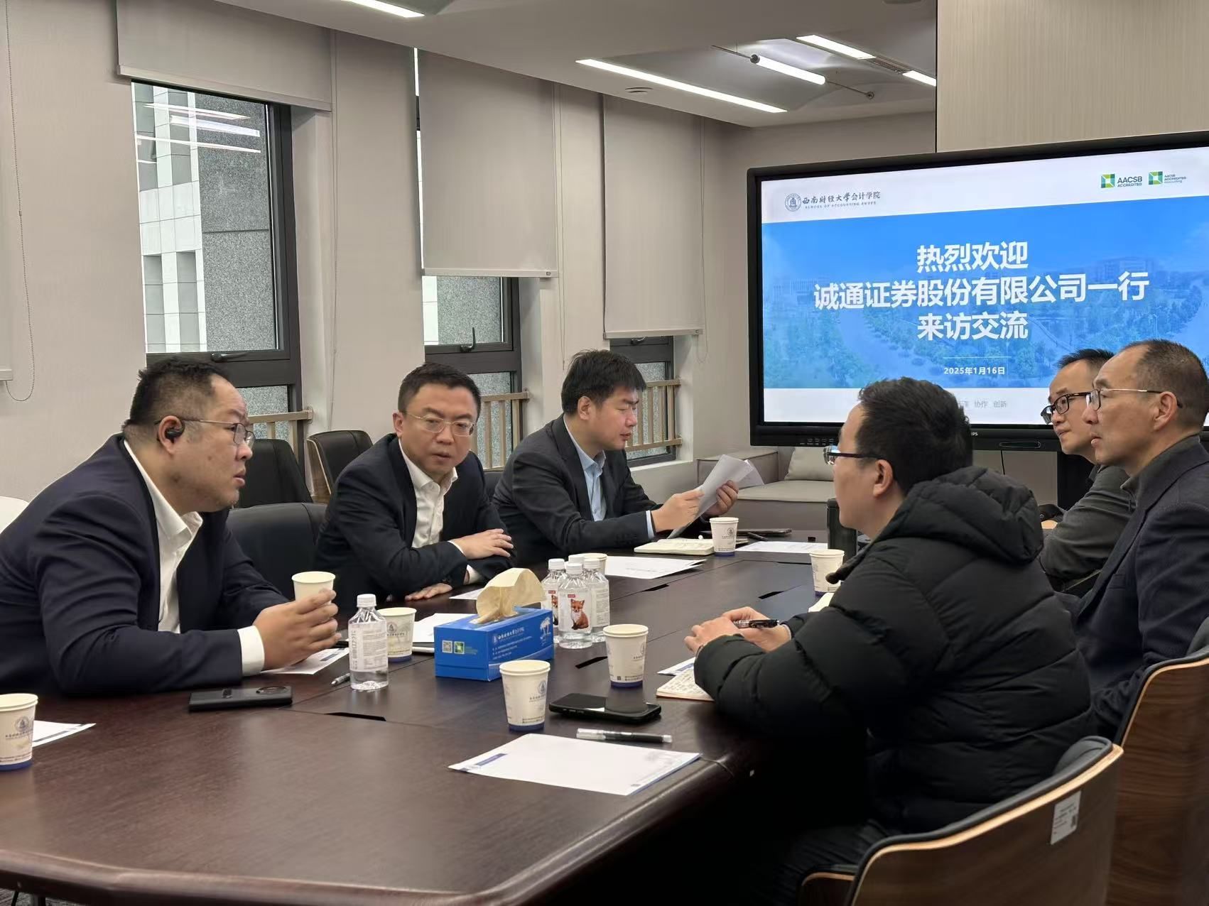 1月16日下午,诚通证券股份有限公司董事长张威带队一行三人来到西财柳林校区,学院经理唐雪松、党委书记刘晓彬、副经理易阳、员工与国内合作办公室主任徐天然一同接待并洽谈合作。