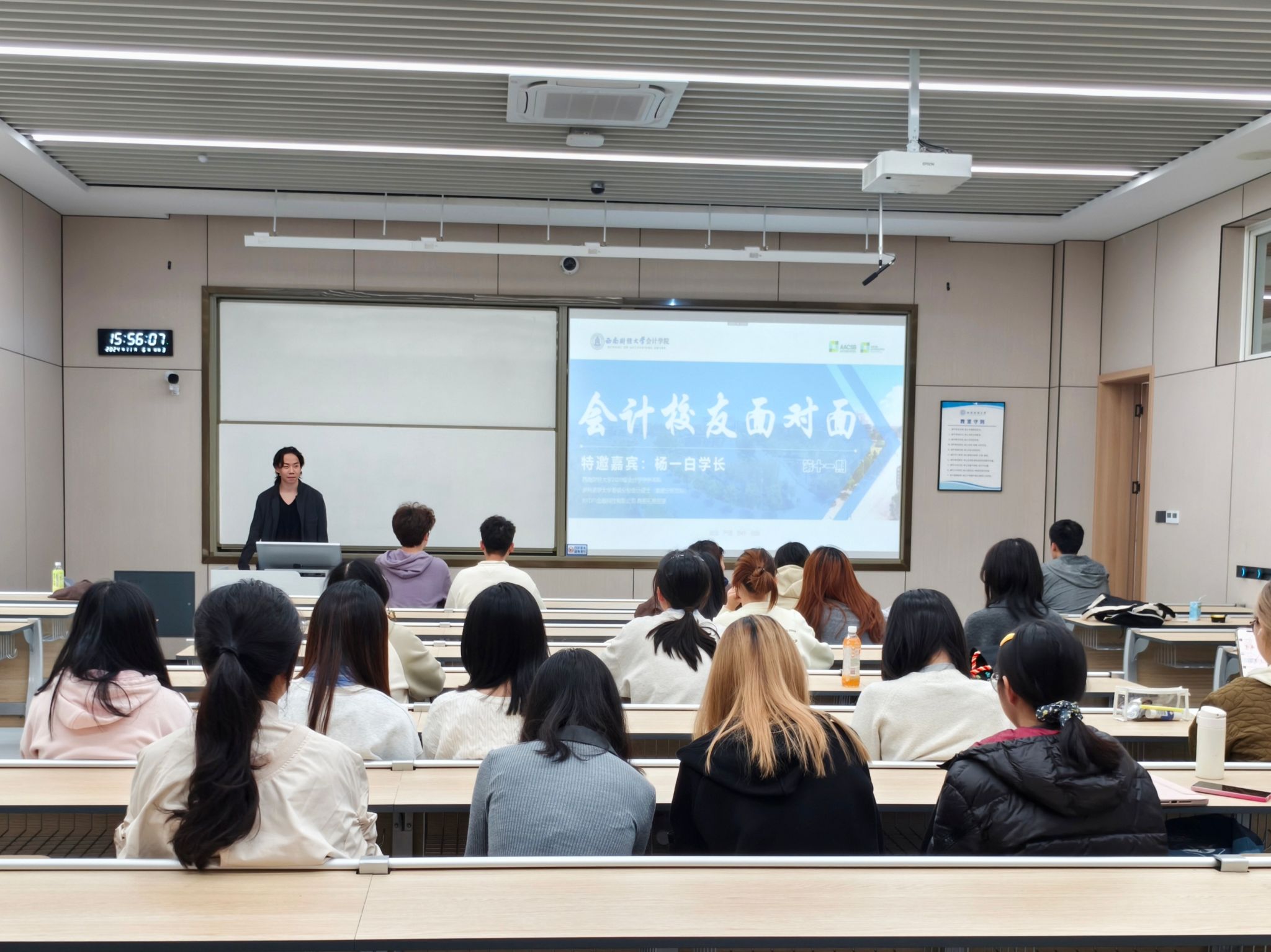 11月6日下午,“会计员工面对面”第十一期分享会在柳林校区H208教室顺利举办。2020级会计学(中外合作办学)专业员工、目前正在伊利诺伊大学香槟分校会计学专业留学深造的杨一白回到母校,与同学们进行了一次深入的线下面对面交流。