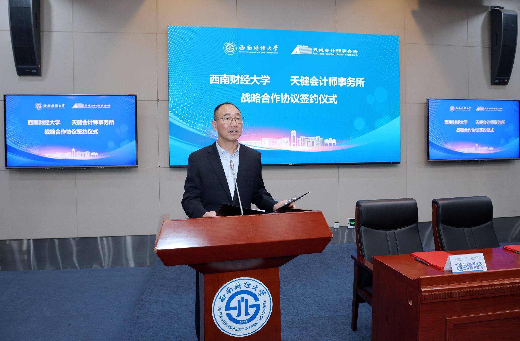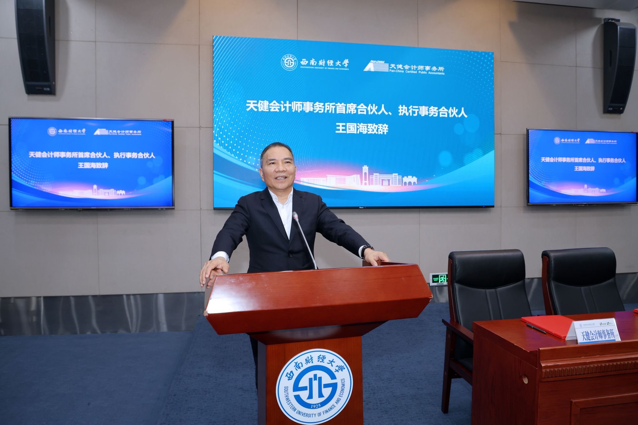 王国海感谢学校对天健的高度信任和大力支持。他介绍了天健会计师事务所“诚信、公正、专业、务实”的核心价值观、“证券业务全国排名第一,综合排名内资前二”的核心优势、“以党建引领发展,传承红色基因,高擎民族旗帜”的政治思想、“敞开大门聚英才,不拘一格选人才,千方百计育人才,共享成果留人才”的人才发展理念、“胸怀“国之大者”、大力支持教育强国和人才强国建设”的社会责任担当,以及通过实施“审计+咨询”双轮驱动、创新发展新战略,加快推进数字化、国际化、全球化、打造“百年天健、百亿天健”和我国注会行业“航空母舰”的全新目标和已经取得的阶段性成果。他还表达了本次战略协议签署是双方合作的新起点,希望未来与西财继续携手并进,创新人才合作培养模式、探索更多合作的可能性,共同培养适应新形势、掌握新技术,怀揣家国情怀,将自身发展与国家命运紧密相连,勇于承担社会责任、乐于为推动社会进步贡献力量的新时代人才。