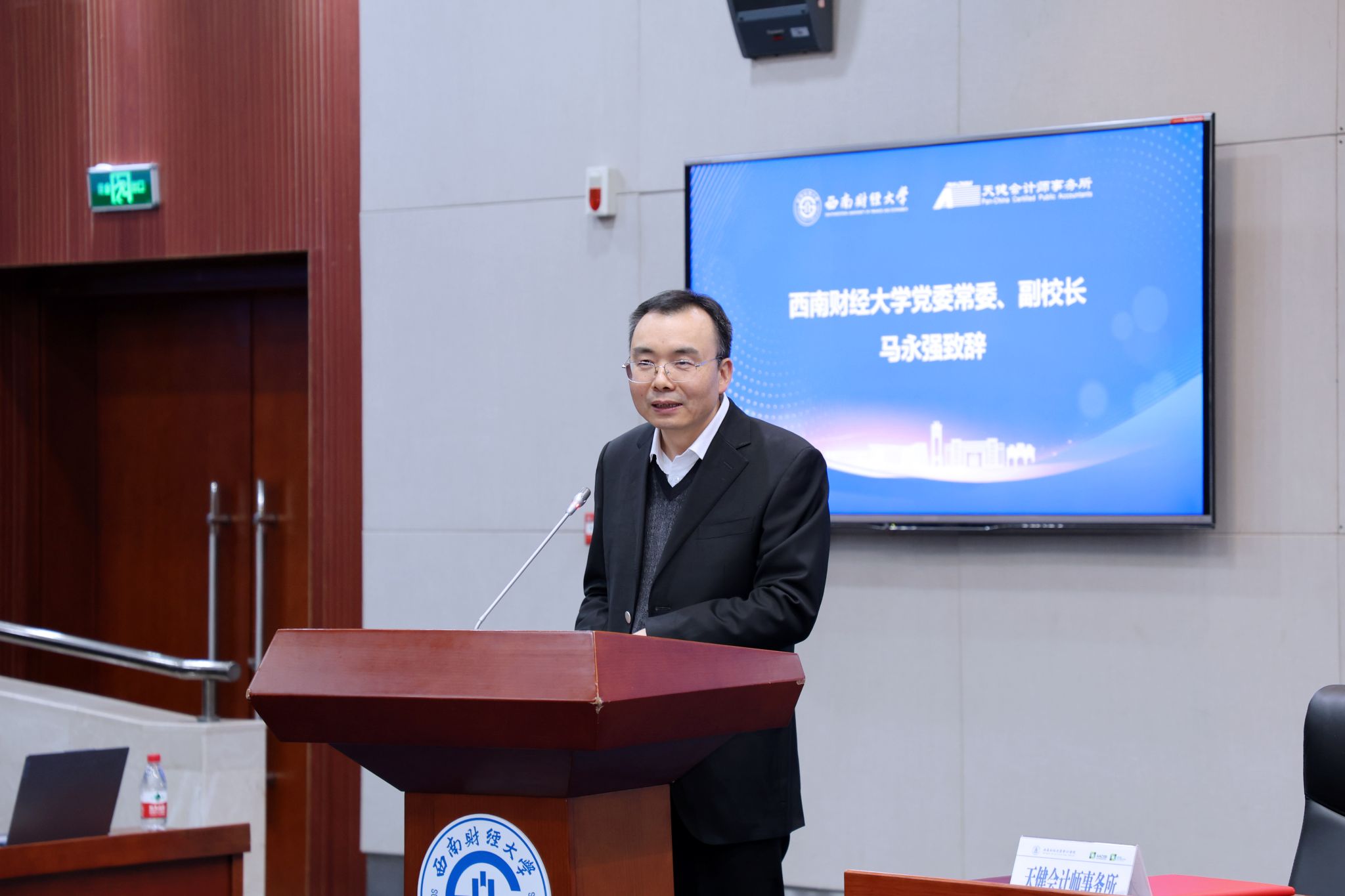 仪式伊始,一段以“百年西财、携手天健、共创未来”为主题的短片牵引与会嘉宾共同回顾了15vip太阳集团与天健会计师事务所二十年的合作历程和丰硕成果。随后,马永强对王国海一行表示热烈欢迎,并对天健会计师事务所长期以来对学校的关心支持表示衷心感谢。他表示,国家正全力构建全面创新体制机制,统筹推进教育科技人才体制机制改革,同时明年恰逢西财百年校庆,站在新的历史交汇点,天健和西财的战略合作也将进入关键发展节点,希望双方以此次签约仪式为契机,继续精心构筑全链条、沉浸式的实践教育模式,特别是在大数据与大模型等新技术背景下的人才培养新模式,并在专业教学全程厚植家国情怀、诚信品质,培育德技双馨的会计师人才,夯实服务国家战略的人才蓄水池。